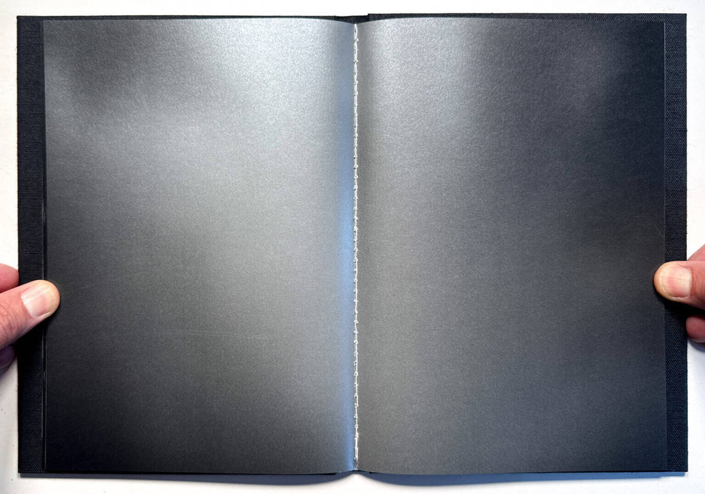 Hardcover wrapped in fabric (inside and out), with silver stamping on the front cover, spine, and back cover. Flaps hold a loose booklet in place. Book composed of a fold-out cover with an inner booklet. Loose booklet held by the first and last pages using the cover flaps. Composed of 48